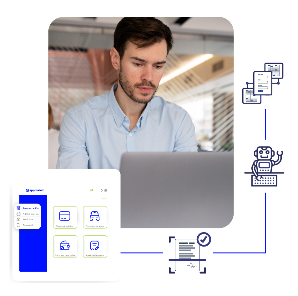 El componente de Automatización (RPA) de Apptividad Onboarding aprovecha la Robotic Process Automation para automatizar tareas repetitivas en el proceso de incorporación de clientes. Esto permite a las instituciones financieras escalar sus operaciones sin aumentar proporcionalmente los recursos, garantizando precisión y velocidad en el manejo de datos.